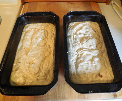 Spoon everything into greased loaf pans and tap on the counter to level the batter.