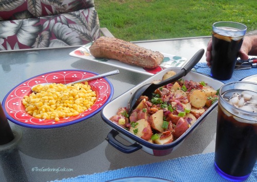 This week, the star side dish for our weekly barbecue is a warm Tuscan bacon potato salad.