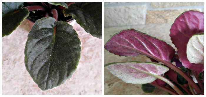 African violets have a variety of shades of leaf color. The leaves have a velvety feel to them and are slightly hairy. The under side of the leaf is often a different color.