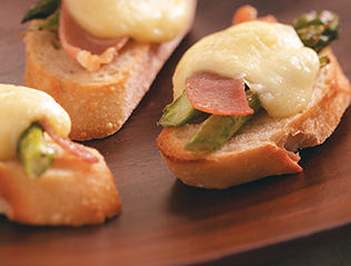 - Top each slice with asparagus, prosciutto and gouda cheese. Broil 3 to 4 inches from the heat for 2 to 3 minutes or until cheese is melted.
