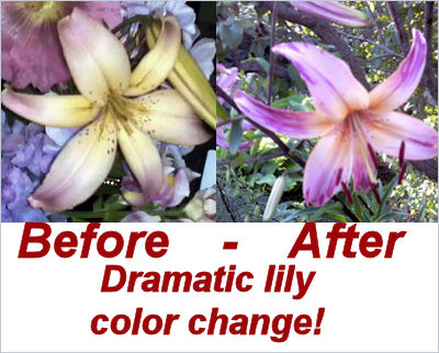 The next photo shows the dramatic change. It is the same lily but a new bulb and shows the flower that has changed color. Look at the difference in color!