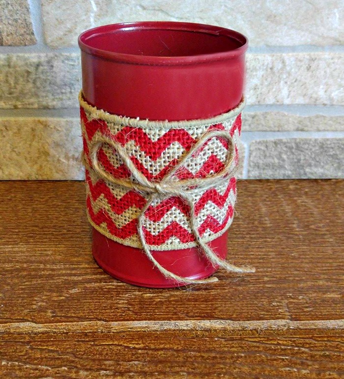 Measure around your cans to see the length that you will need for the burlap ribbons. Cut them to size and wrap one can with the burgundy and lace ribbon for decoration.
