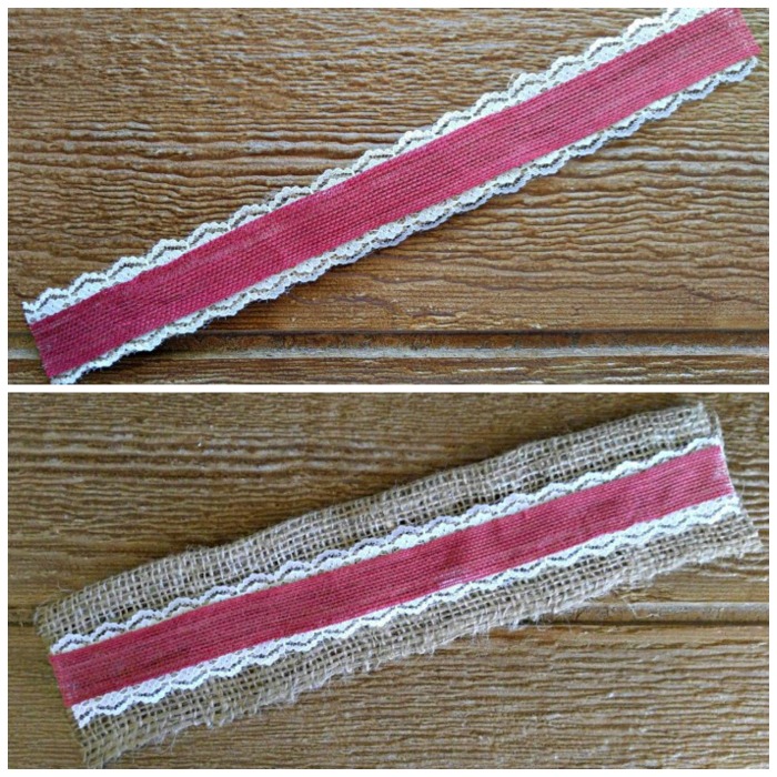Lightly attach the 3/4″ wide burgundy ribbon to the middle of the 1 1/2″ wide burlap lace ribbon with hot glue. Then attach this piece to the middle of the wide plain burlap ribbon.