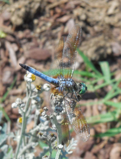 Close up of a dragonfly feasting on the flowers of a Dusty miller plant in my test garden.