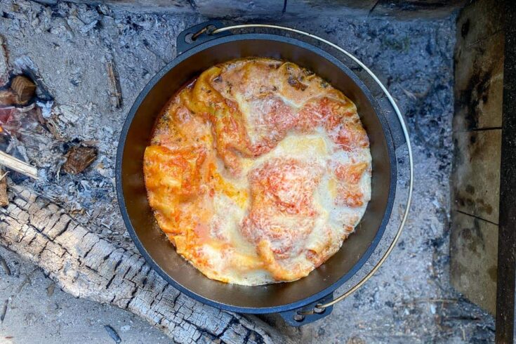 This lasagna is cooked in cast iron, which makes it perfect for a campfire meal.