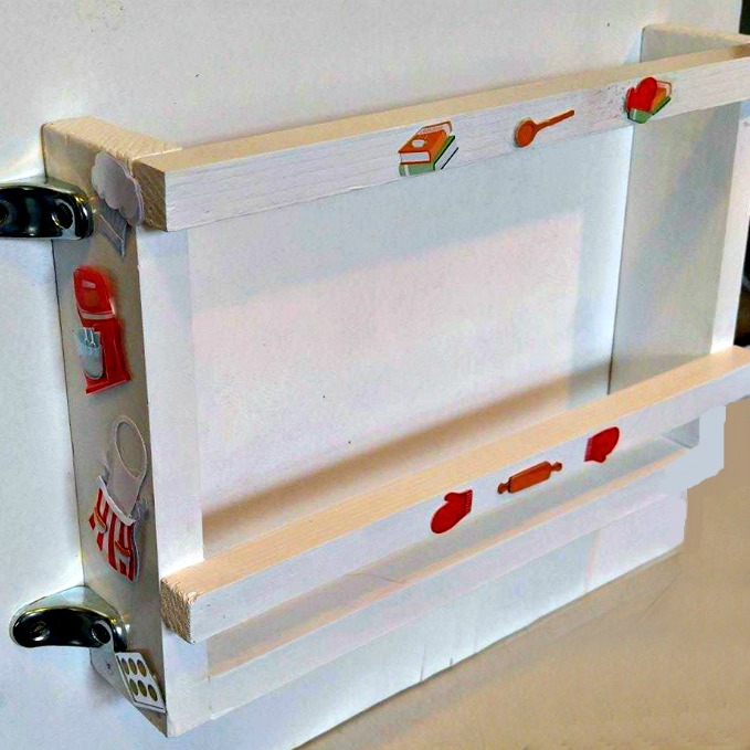 Here is the holder attached to the cabinet doors. It holds my cutting boards and wire baking racks in place, gives me a bit of much needed counter space and looks cute as can be.