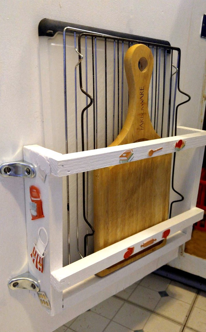 ThisDIY Cutting Board Holder that fits neatly behind my cabinet door and holds my wire racks too!.