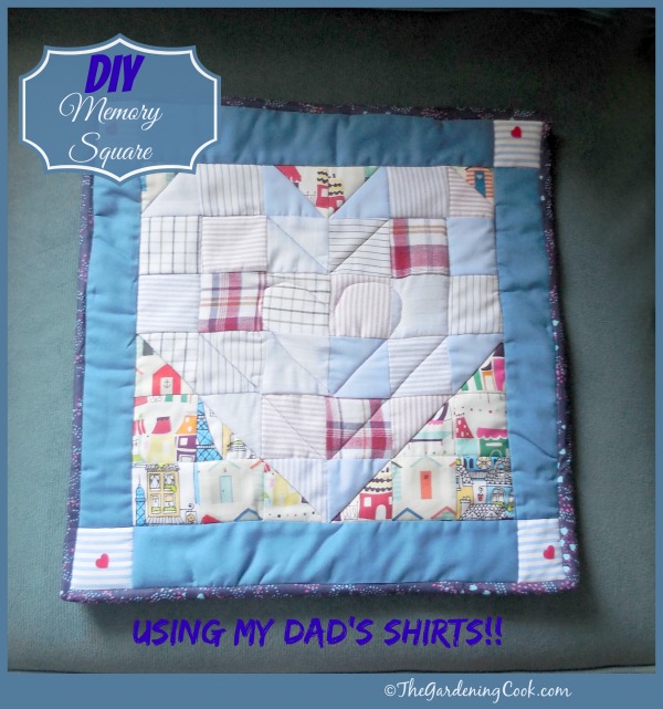 DIY memory square made from recycled old shirts. See how to make yours at thegardeningcook.com/diy-memory-squareI have it hanging in my kitchen and look at it often.  I remember most of the pieces of clothing used in the memory square and it makes me smile when I see them all stitched together.