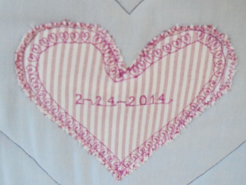 border of memory cloth7.  Use the sewing machine stitch two heart shapes, one on the edge of the large heart section and the other inside it. (leave enough room in the center for the heart shaped date of birth that will be stitched to the back.