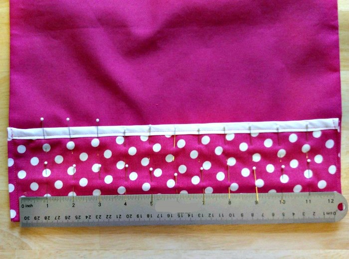 Since I like the contrast, it made the project come together more quickly. Fold the bottom edge of the pen holder up 3 1/2″ and pin the material in place so that you have a long pink bottom “pocket” of the polka dot material.