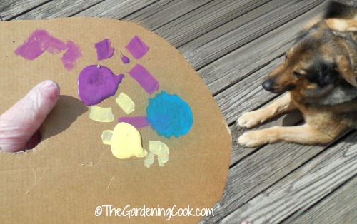 Now I needed something to hold my paints for the touch up. I don’t ever bother with a palette. I just cut a sturdy piece of cardboard in a circle and then cut a hole it in. It works perfectly to hold small blobs of paint.