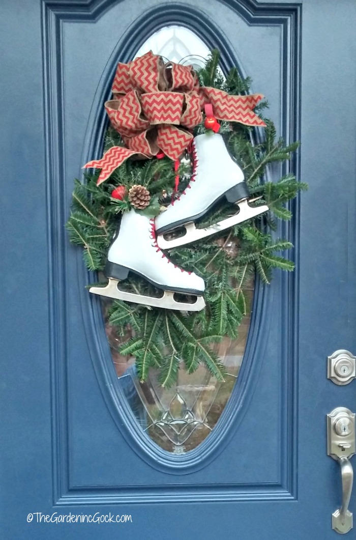 The ice skate door swag is held in place with two extra large glass wreath hangers.