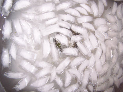 When the two minutes were up, I took them out of the pot of boiling water and dumped them into the ice bath to stop them cooking.