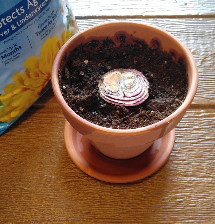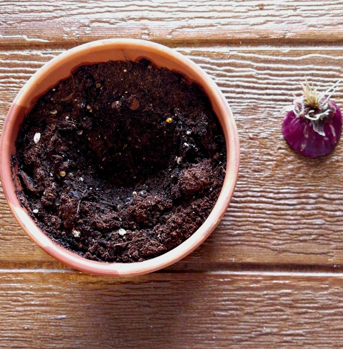 Place the onion in the soil and push the soil well around the roots. Place in a sunny spot for a few weeks. You will want to keep the soil evenly moist but not really wet.