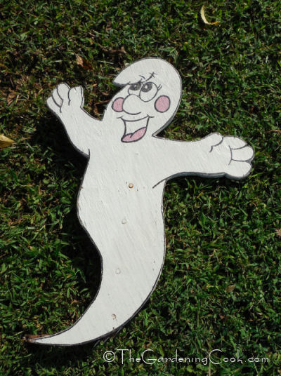 I love his little green striped hat. The ghost was the easiest decoration to do. Very little painting was involved after the white paint was applied.