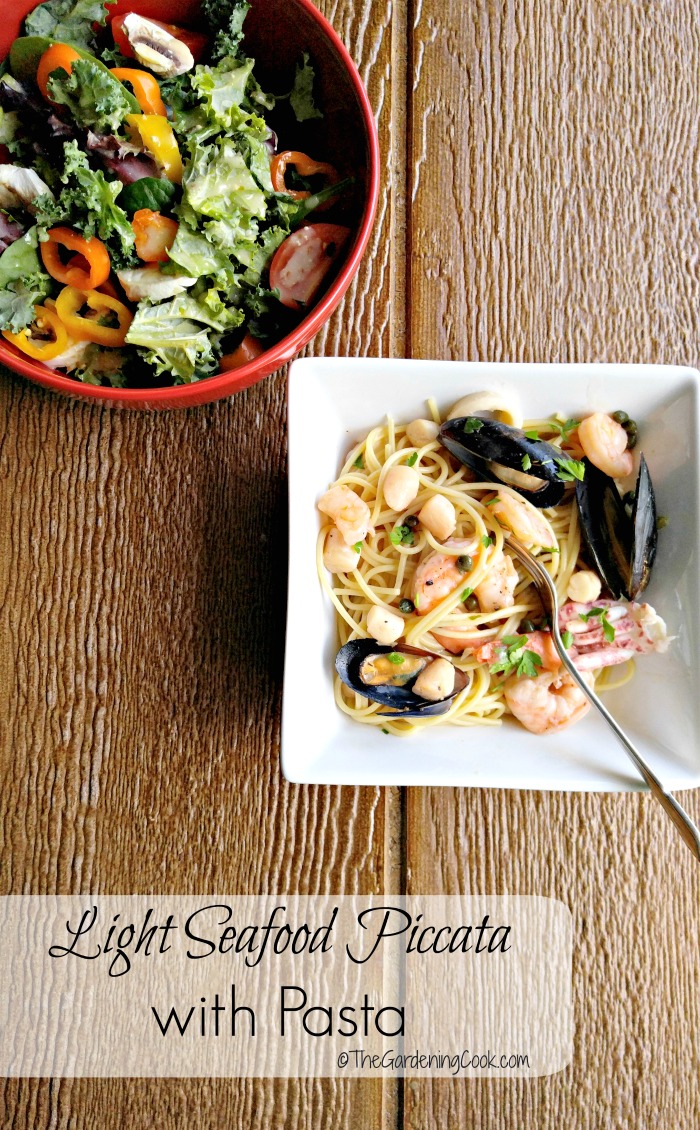This light seafood piccata with pasta recipe comes together quickly. Most of the cooking can be done while the pasta is cooking.