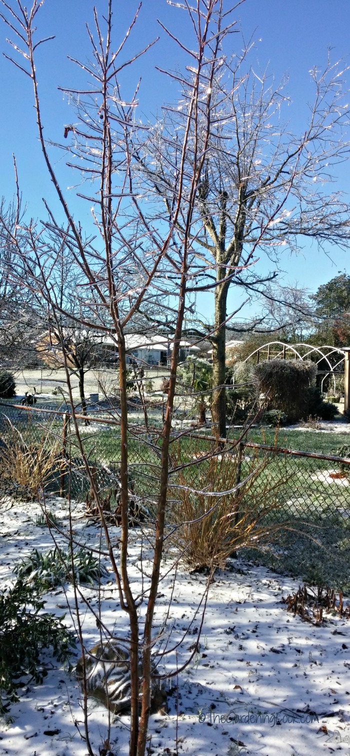 I have two flowering Hawthornes. The display of flowers on them, the spring is amazing. But they lose all the leaves in winter….which makes them the perfect place for ice to form!