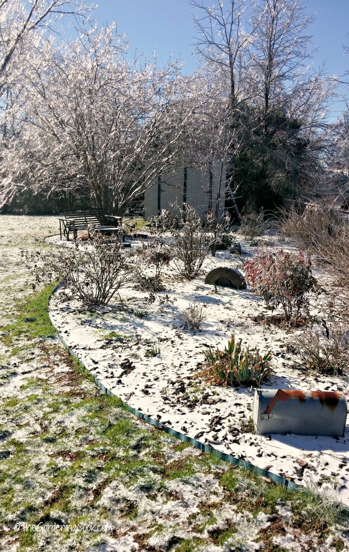 The entire garden is blanketed with a dusting of snow. That is not much to brag about or get excited about. But the ICE!