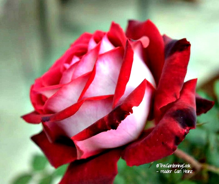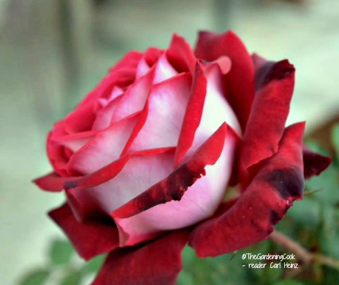 Here is another photo of an untouched Osiria rose submitted by Tammy B. I love the way the colors show on opposite sides. So pretty! Tammy said that all she had to do to get this gorgeous thing to grow was to water it, prune it and put down mulch.