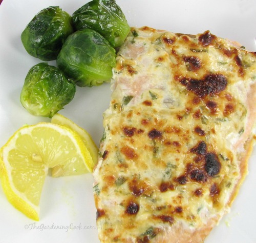 - Spread the topping mixture evenly over top of the salmon. Very lightly sprinkle with bottled grated Parmesan. (I use fresh Parmesan cheese normally in everything but I like this dish with just a touch of the bottled which is drier on the very top of the fish.)