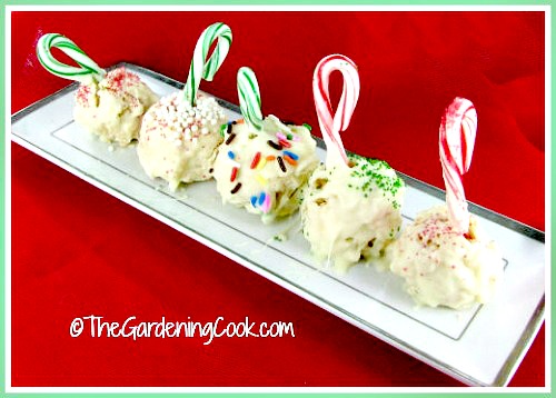 - Remove the treats from the fridge and reform into better shaped balls. Be sure the candy cane is straight and securely in the middle of the ball.