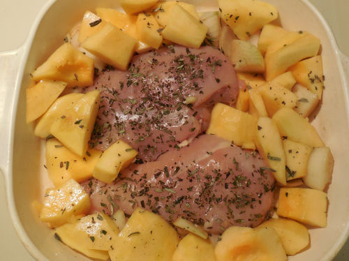 Spray a baking dish with Pam cooking spray. Place chicken in the pan and spread the squash and onion around it; Season the vegetables with other half of the rosemary, salt and pepper.