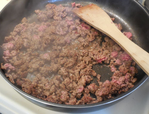 - Cook the ground beef in a skillet over medium heat until no longer pink.