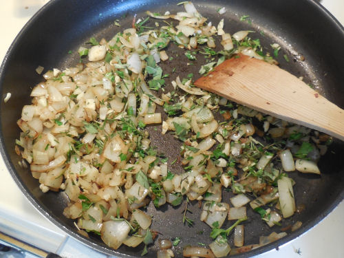When the onions are translucent, stir in the fresh herbs. I used thyme, parsley and a bit of rosemary this time. (any spices will do. Basil is also good but I didn’t have any today.)