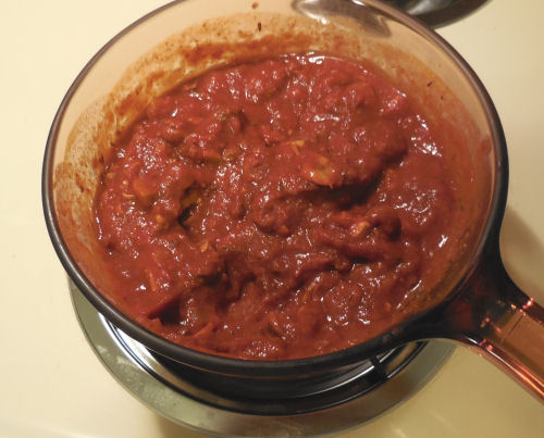 Most of the time I use a basic marinara sauce, which uses freshly roasted tomatoes but for this one, I just chose canned, crushed tomatoes, and some tomato paste as the sauce base. (and of course some wine…I use it a lot in cooking and almost always in Italian cooking.)