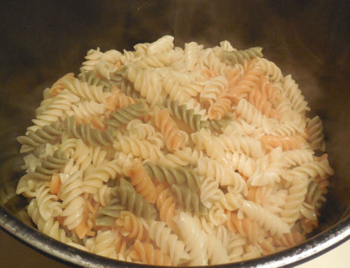 Boil your choice of pasta in salted water according to package directions and drain. Today I used a tri color rotini Smart start pasta with extra fiber. I cooked the whole box.