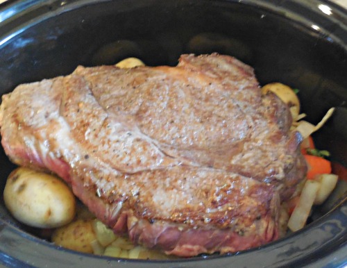 - Place the vegetables and herbs into the crock pot and add the beef on top. Pour the liquid over everything. Cook on low 8 hours or more.