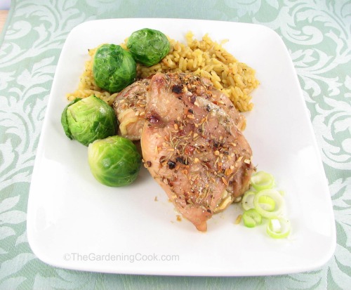 Onions, garlic and red pepper gives a nice kick to these seasoned baked chicken thighs.