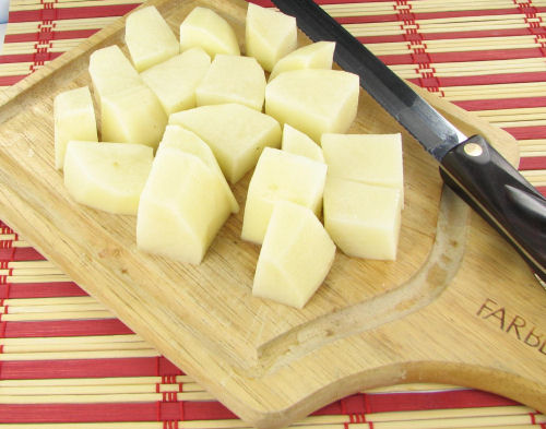 - Peel and cut potatoes into evenly sized pieces. Place them in a medium saucepan. Cover with cold water; add 3/4 tsp salt. and bring to a simmer. Raise the heat to medium and cook until a knife slips in and out easily. Drain the potatoes in a colander.