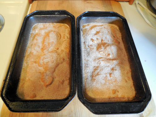 Spoon everything into greased loaf pans and tap on the counter to level the batter.