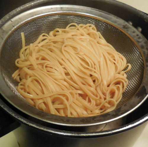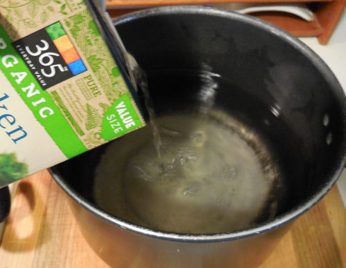 Combine water and 1/2 cup of chicken stock. Cook the pasta until al dente. I used linguine today because I had no spaghetti on hand.