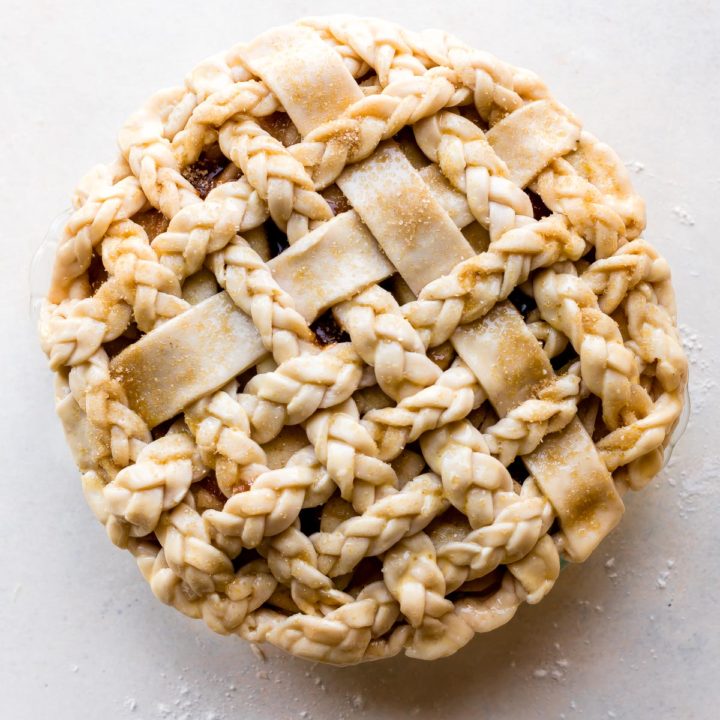 To make this pretty pie crust, simply cut very cold pie crust dough into strips. The wider the strip, the more rustic the pie will look. You can even a pastry wheel to give the strips a scalloped edge finish.