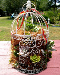 - Adding succulent plants, laying on their sides, on the outside edges of the soil so they're poking out of the bird cage.
