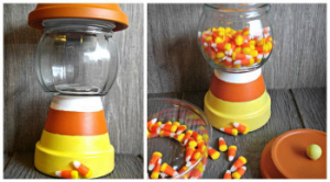 This adorable DIY candy jar is made from a clay pot and saucer and painted in the colors of the traditional Halloween treat - candy corn.