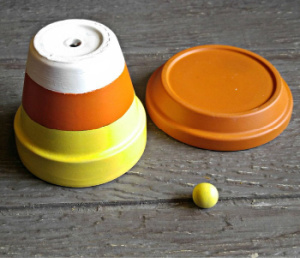 This tutorial walks you through each step, from painting the pot in candy corn colors to securely attaching the lid on the top.