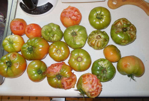 In order not to lose my mind, and all my tomatoes, I went out and brought in EVERY tomato left on the vines. Big ones, small ones, anything I thought they might eat.