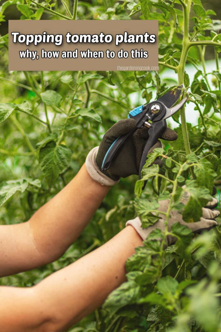Would you like a reminder of this tutorial for topping indeterminate tomatoes? Just pin this image to one of your gardening boards on Pinterest so that you can easily find it later.