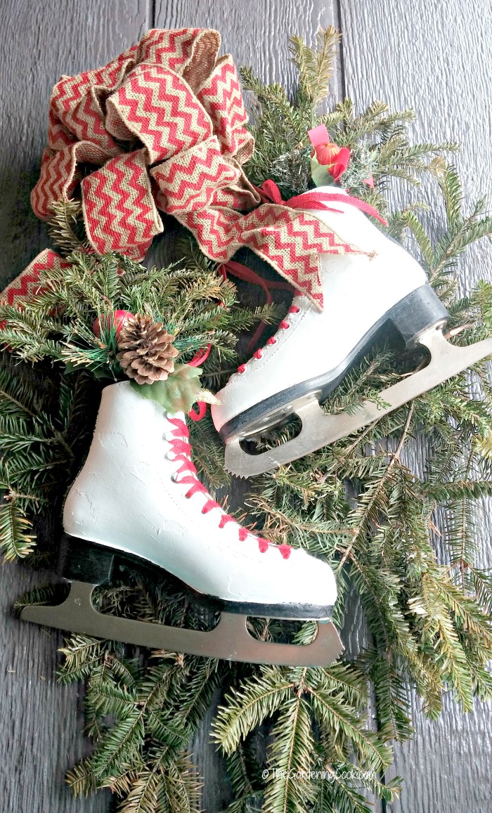 The oval glass means that a normal wreath won’t work, so I make an elongated swag instead. Today, we’ll be dressing it up with ice skates for a wintry look.