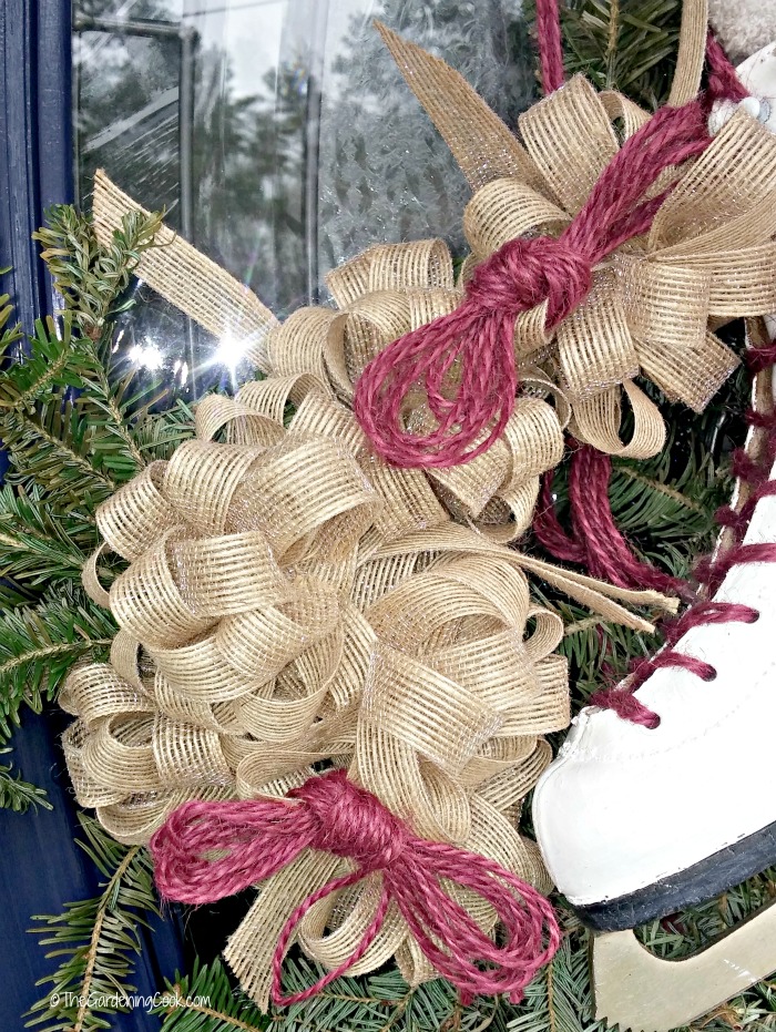 The jute twine was going to be used to make some extra small bows to add to the finished larger bow. My Winter Door Swag Makeover is coming together nicely now.